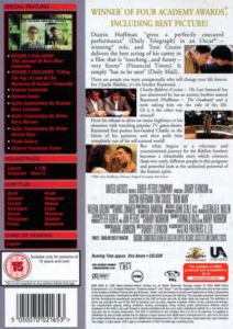 | "The Journey of Rain Man" Featurette "Lifting The Fog: A Look at the mysteries of Autism" Featurette Original featurette Deleted Scene Audio Commentary by Director Barry Levinson Audio Commentary by Writer Barry Morrow Audio Commentary by Writer Ronald Bass Photo Gallery Original Theatrical Trailer |
