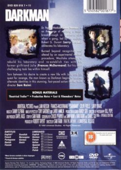 Dr. Peyton Westlake is on the verge of realizing a major breakthrough in synthetic skin when his laboratory is destroyed by gangsters. Having been burned beyond recognition and forever altered by an experimental medical procedure, Westlake becomes known as Darkman, assuming alternate identities in his quest for revenge and a new life with a former love.Cast
