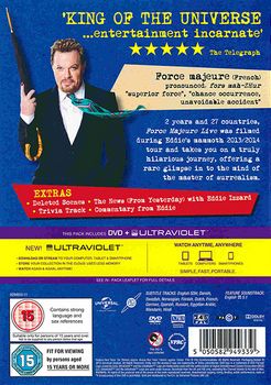 Force Majeure (French) (pronounced: fors mah-ZHur), "superior force", "chance occurrence, unavoidable accident": 2 years and 27 countries, Force Majeure Live was filmed during Eddie's mammoth 2013/2014 tour and takes you on a truly hilarious journey, offering a rare glimpse in to the mind of the master of surrealism.Cast