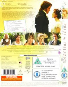 | THE POLITICS OF DATING (4:24), THE STATELY HOMES OF PRIDE AND PREJUDICE interactive map: Chatsworth House (2:56); (9 images (:36)), Burghley (3:53); (15 images (1:00)), Wilton House (2:30); (10 images (:40)), Basildon Park (2:13); (16 images (1:08)), Groombridge Place (4:24); (9 images (:36)), THE BENNETS (6:02), THE LIFE AND TIMES OF JANE AUSTEN (8:03), PRIDE AND PREJUDICE FAMILY TREE, GALLERIES OF THE 19TH CENTURY: Clothing & Costumes (31 images (2:04)), Jewellery & Accessories (11 images (:40)), Furniture & Furnishings (16 images (1:04)), ON SET DIARIES (6:17), ALTERNATE US ENDING (2:29), DIRECTOR’S COMMENTARY (Joe Wright (subtitled)) |