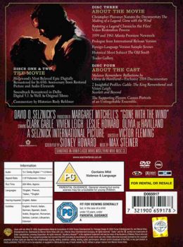 | Disc 01 | Discs One and Two: Commentary by film historian Rudy Behlmer. Disc Three: 'The Making of a Legend: Gone with the Wind ' 1989 documentary. 'Restoring a Legend' documentary. Footage from 1939 Atlanta and 1961 Civil War Centennial Atlanta premieres. 'The Old South' 1940 theatrical short directed by Fred Zinnemann. International prologue. Foreign-language version sample scenes. Trailer gallery. Disc Four: 'Melanie Remembers: Olivia de Havilland Recalls Gone with the Wind ' documentary. 'Clark Gable: A King Remembered' documentary. 'Vivien Leigh: Scarlet and Beyond' documentary. Mini documentaries covering lives and careers of most prominent cast members. |